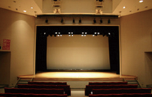左右に大階段が伸び、そのいかめしさをやわらげるように、やさしい色の家具が置かれている。