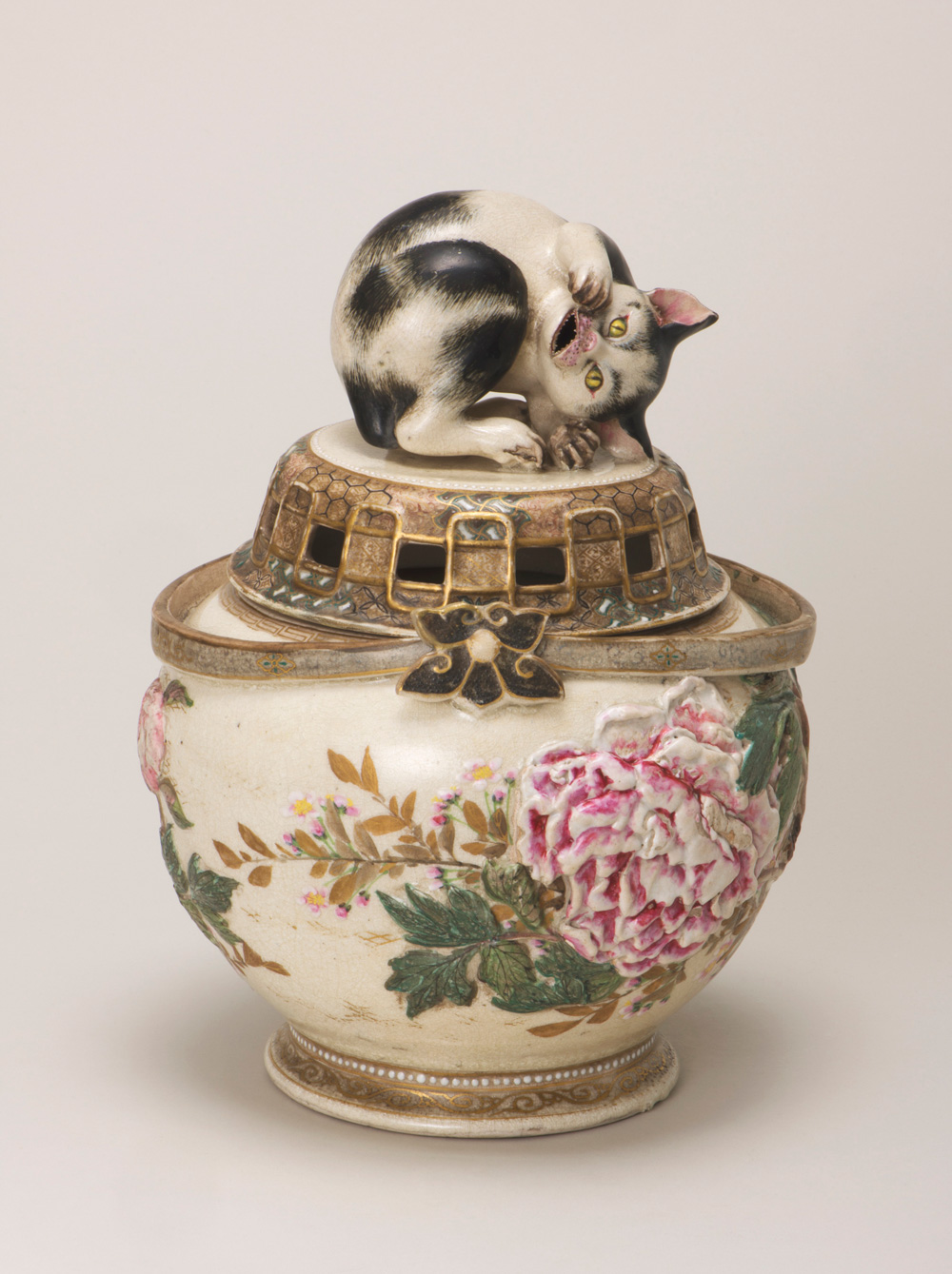 Miyagawa Kozan (I), "Large incense burner with sculptural relief of peony and sleeping cat awaken," early Meiji Era (second half of the 19th century), 29.7×22.7×22.7 cm, long-term loan from Tanabe Tetsundo collection