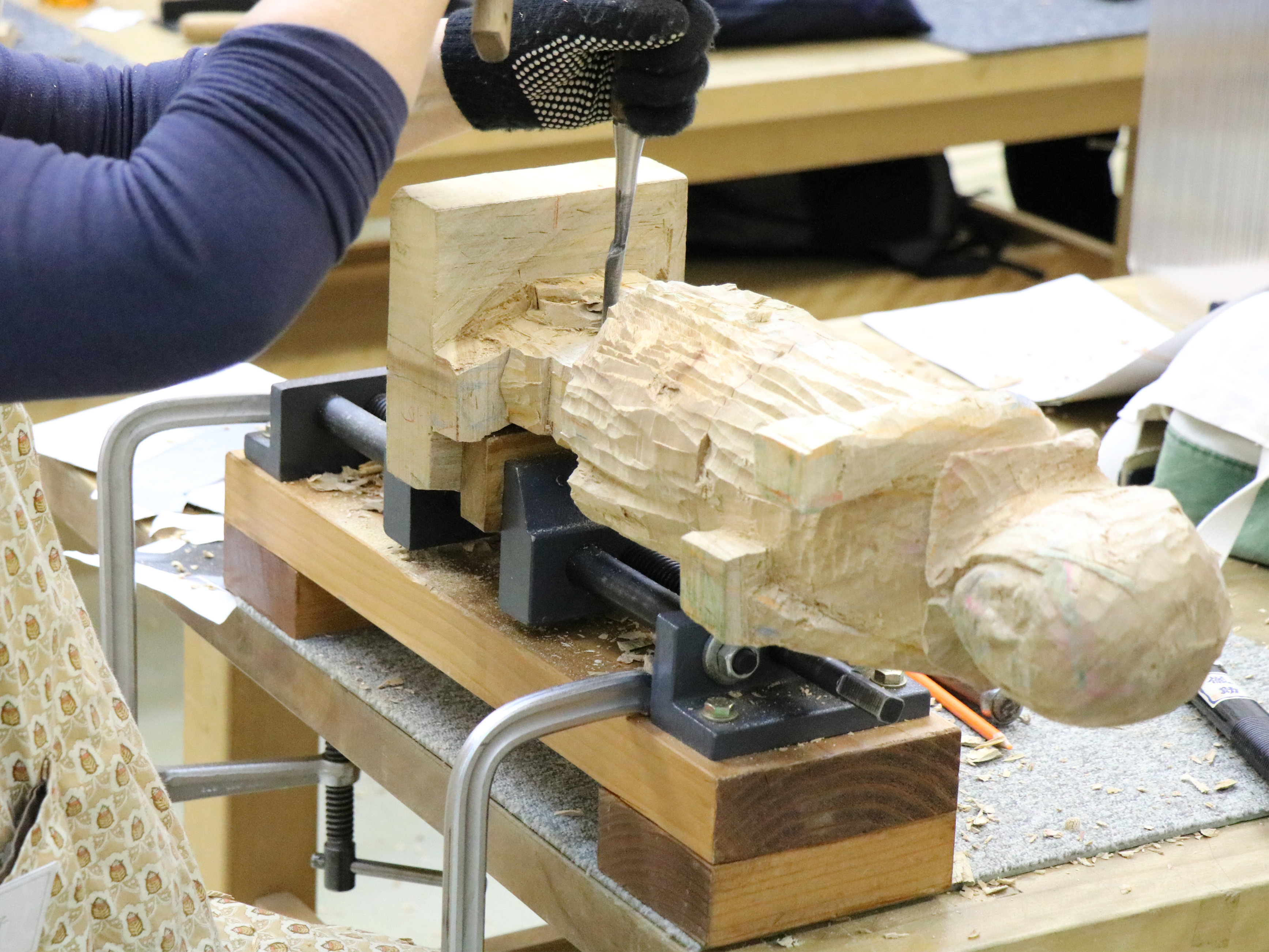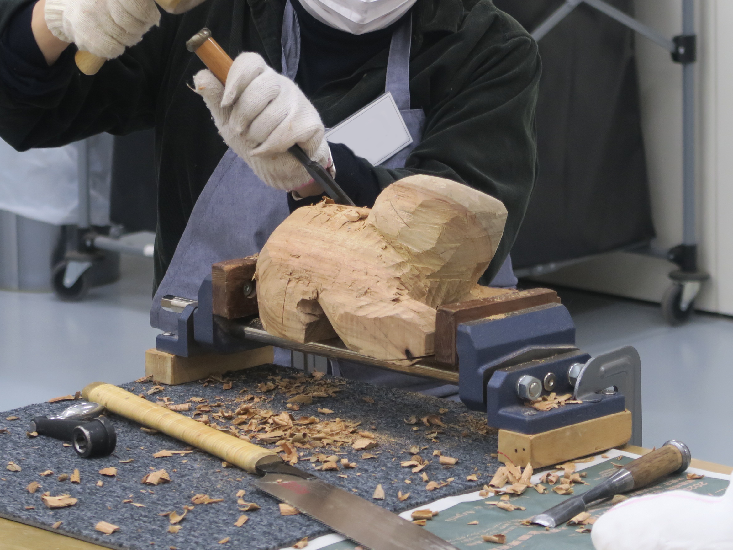 市民のアトリエ立体室の、木彫や木の作品制作のオープンスタジオ、講座等の参加者で参加期間中に制作が思うように進まなかった方、完成できなかった方、自宅で続けて制作することが困難な方のためのコースです。制作予定だった木材や制作途中の作品をお持ちいただき、立体室の道具を使用して続きの制作ができます。制作中の作品はお預かりします。基本的に自主制作ですが、慣れていない方は、道具の使用、制作内容についてエデュケーターに相談しながら制作できます。