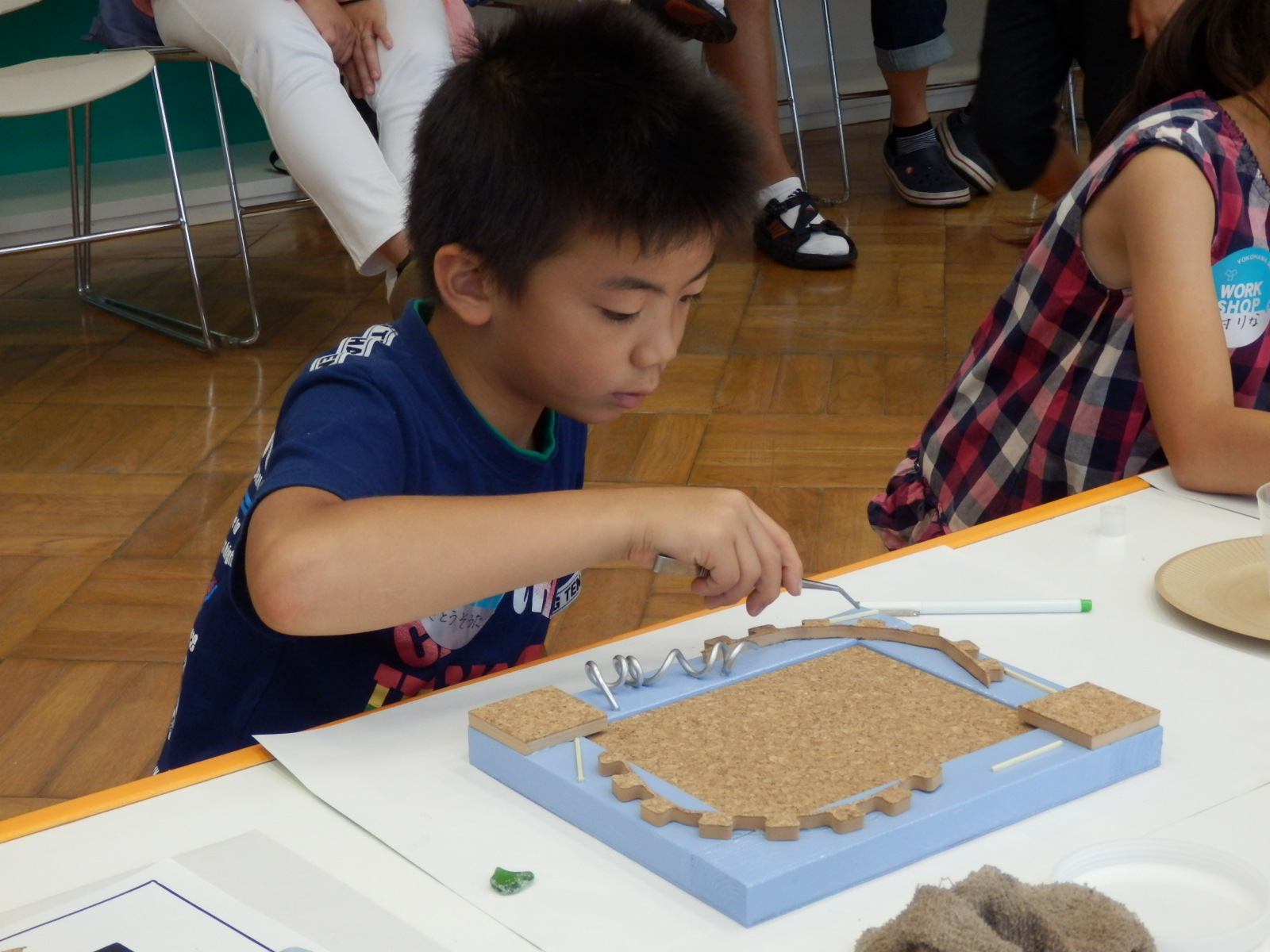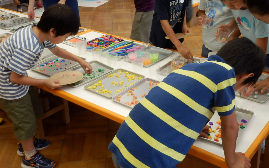 黄色・白・紺色の3色からベースを選び、ビーズやタイルなどさまざまな素材で自由にデコレーション。