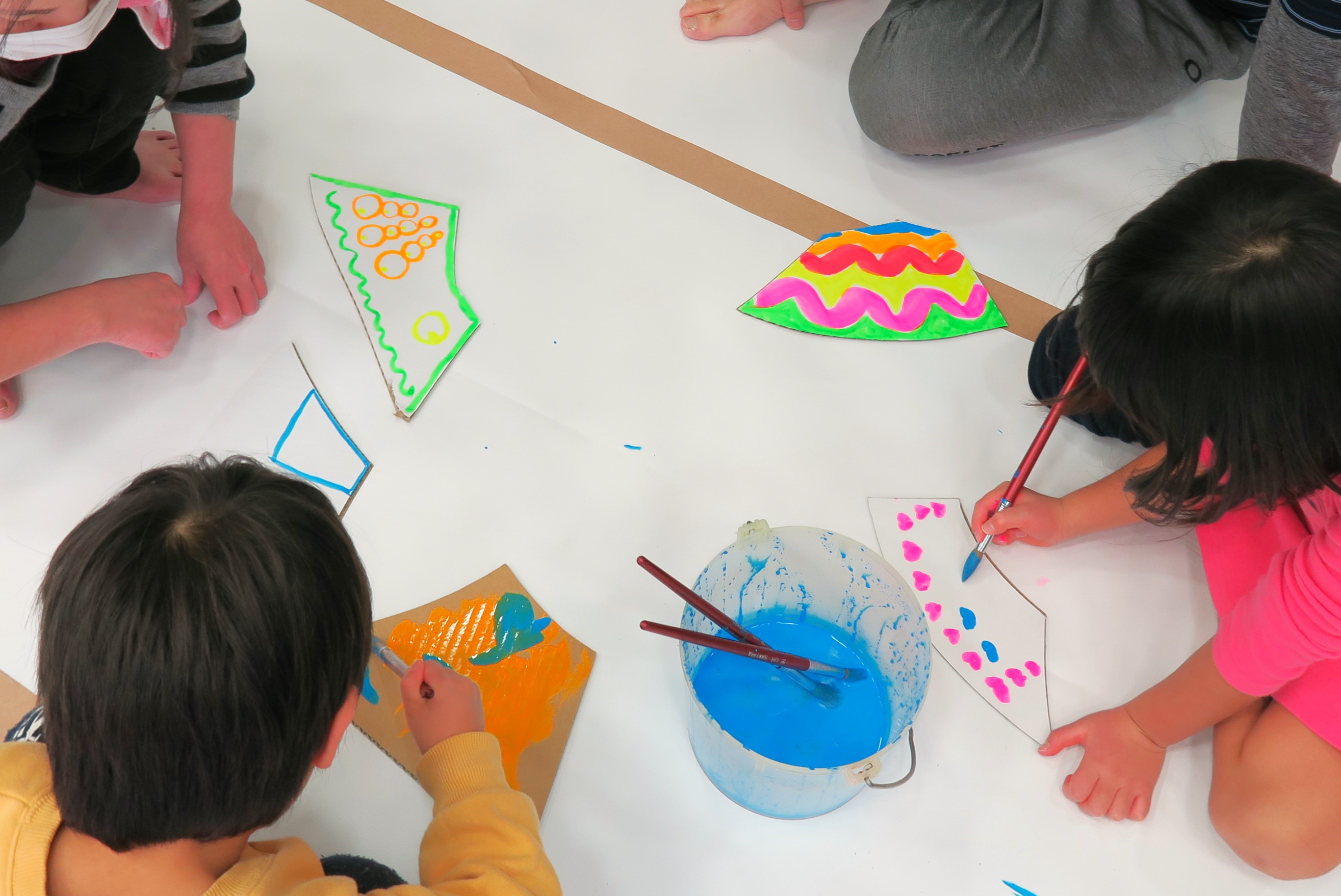 絵の具コースでは水彩絵の具を使います。筆を使って点々を描いたら、次は線を描いて、丸を描いて、とあそびながら筆の使い方や色の混ぜ方を学びましょう。
