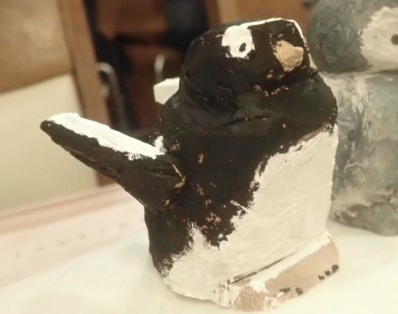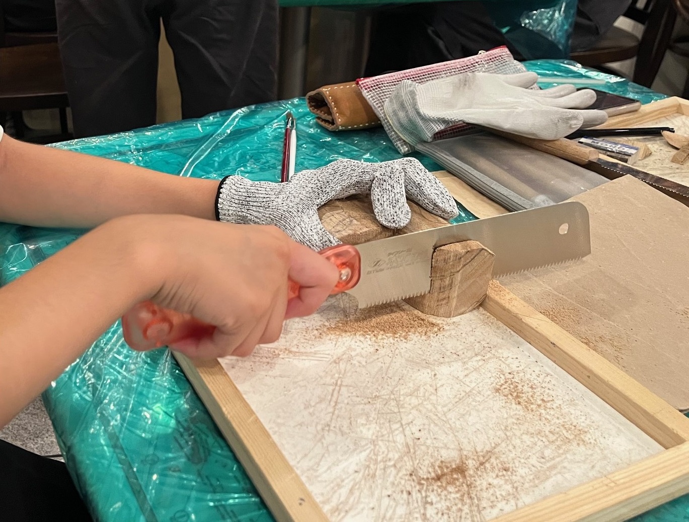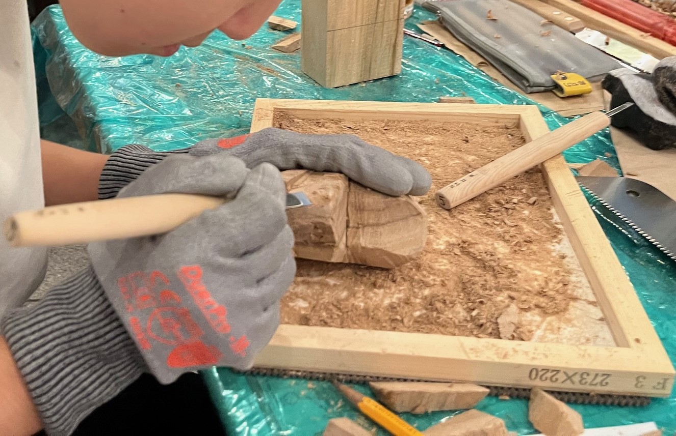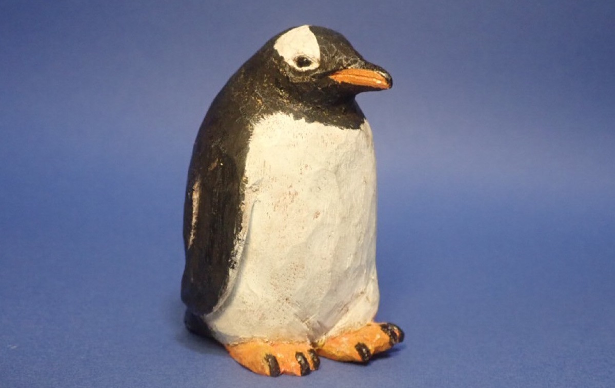 ノコギリや彫刻刀を使って、手のひらサイズの楠(くすのき)からペンギンを作ります。楠は、ほどよい堅さと粘り気があり、細工がしやすいことから彫刻にとても適した木材です。木のかたさや手ざわり、ほのかにただよう楠のいい香りを感じながら、少しずつ形を彫りだしていきましょう。